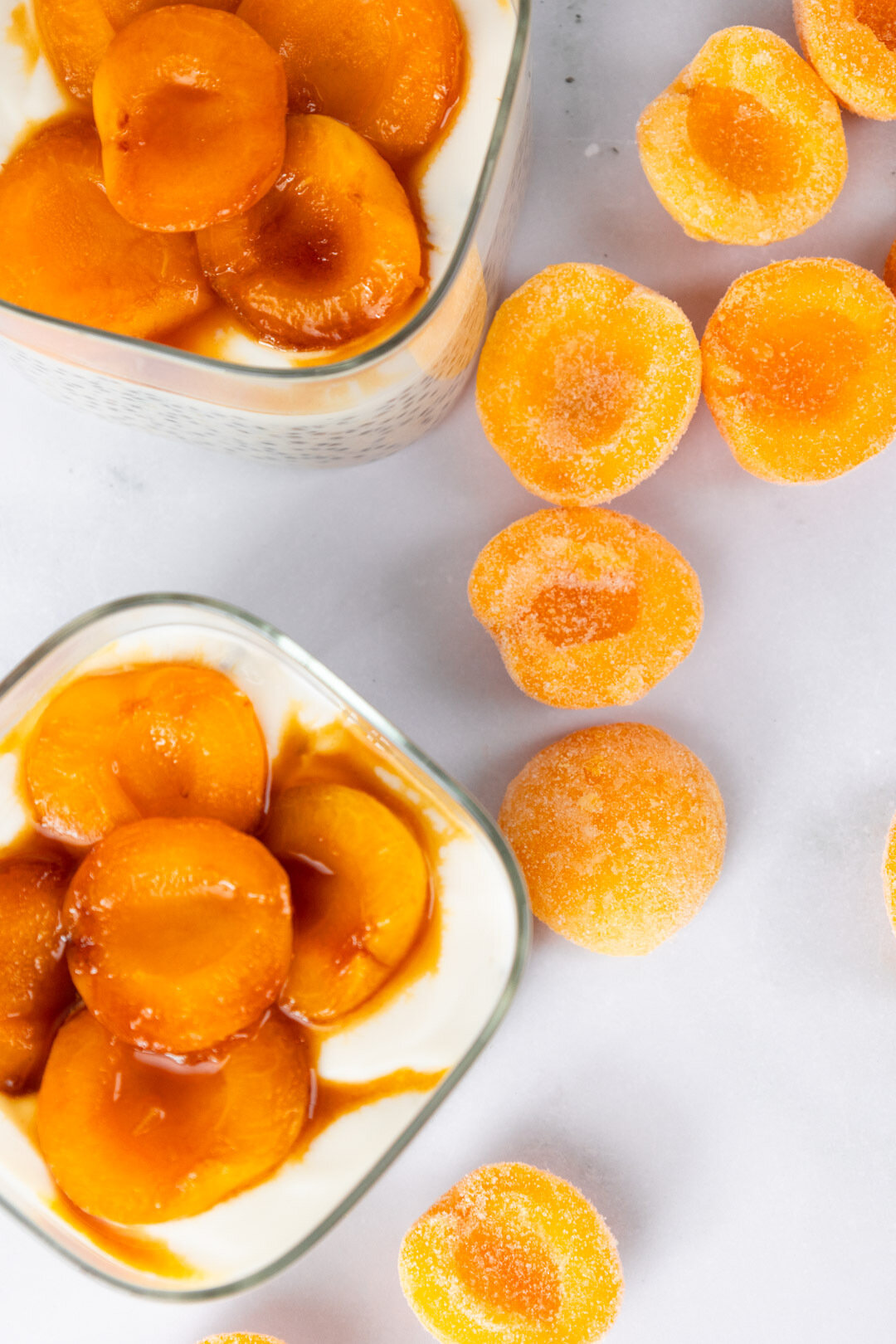 Sprinkle the brown sugar on the apricot halves and bake in the oven for 15 min on 180°C.