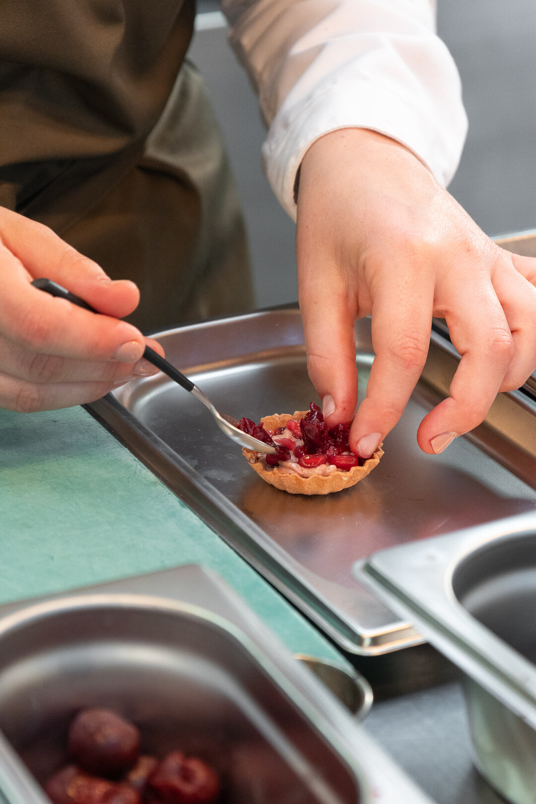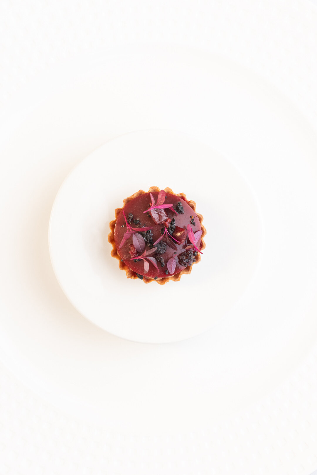 tartelette cases - ganache faux gras - cherry powder - cherry jelly - cherry gel - frozen pomegranate seeds - frozen sweet cherries - scarlet cress