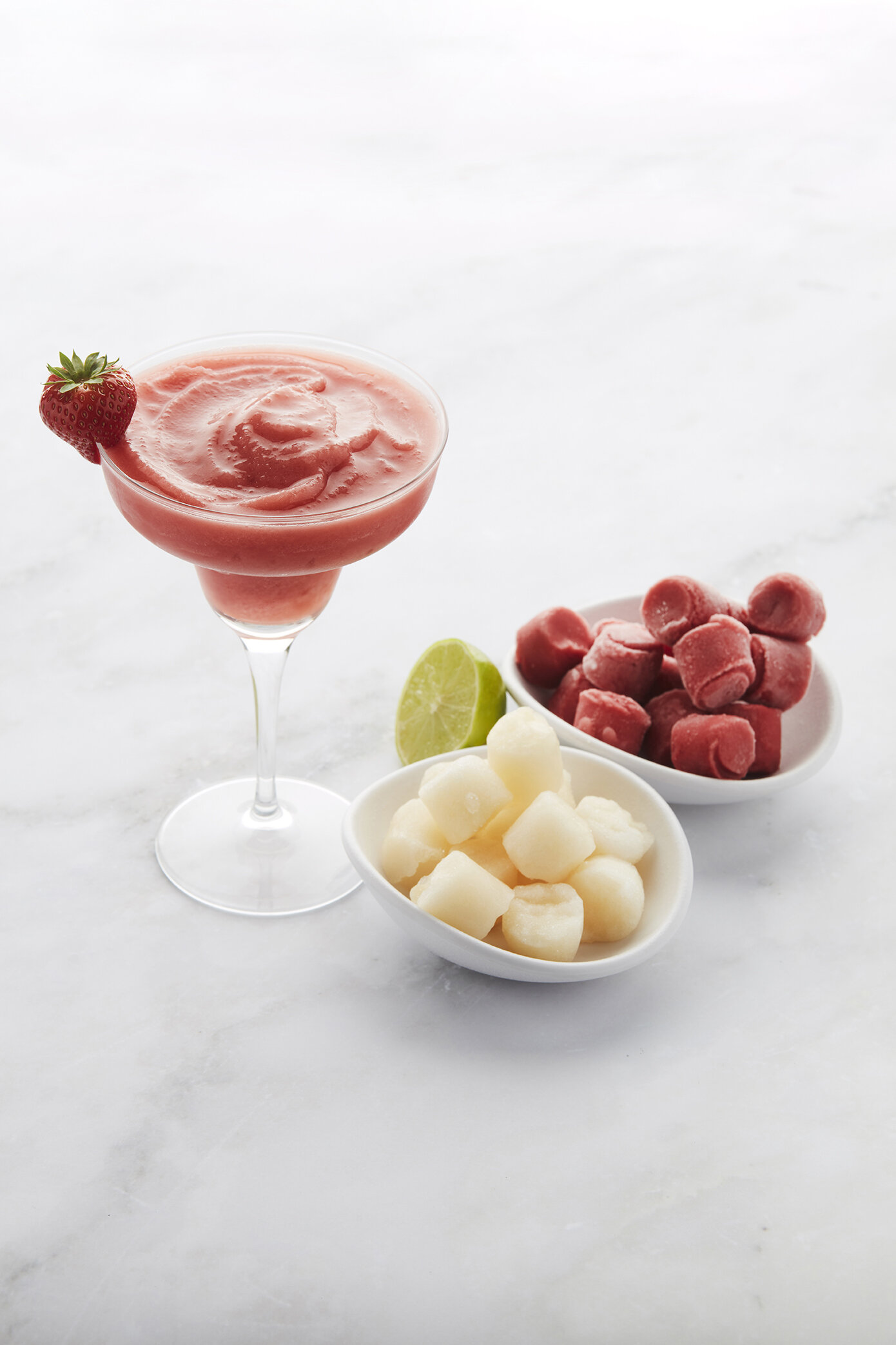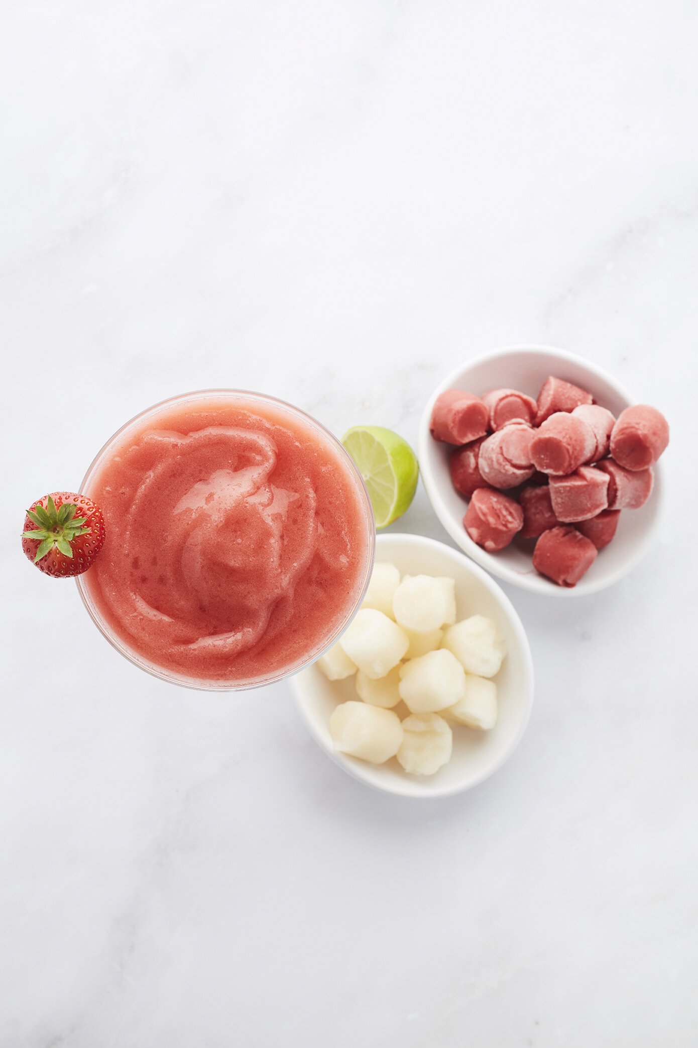 In a blender, combine the strawberry and lime puree portions, rum, and sugar cane syrup. Blend until smooth.
