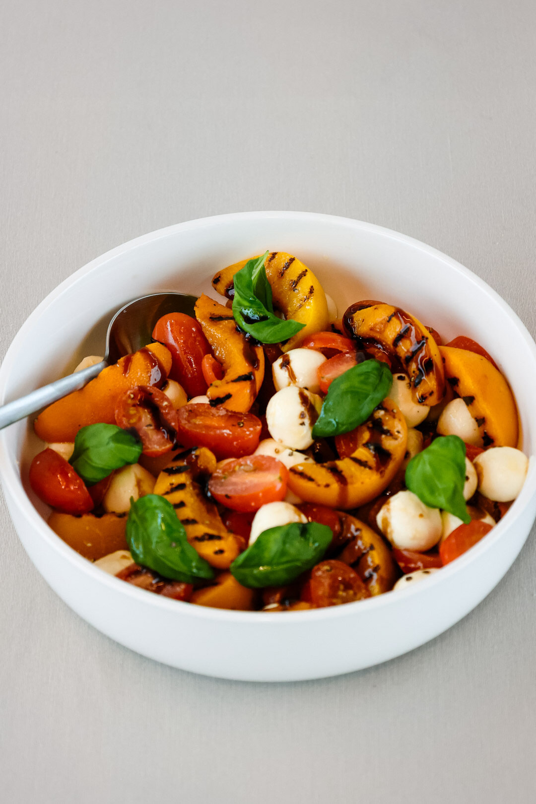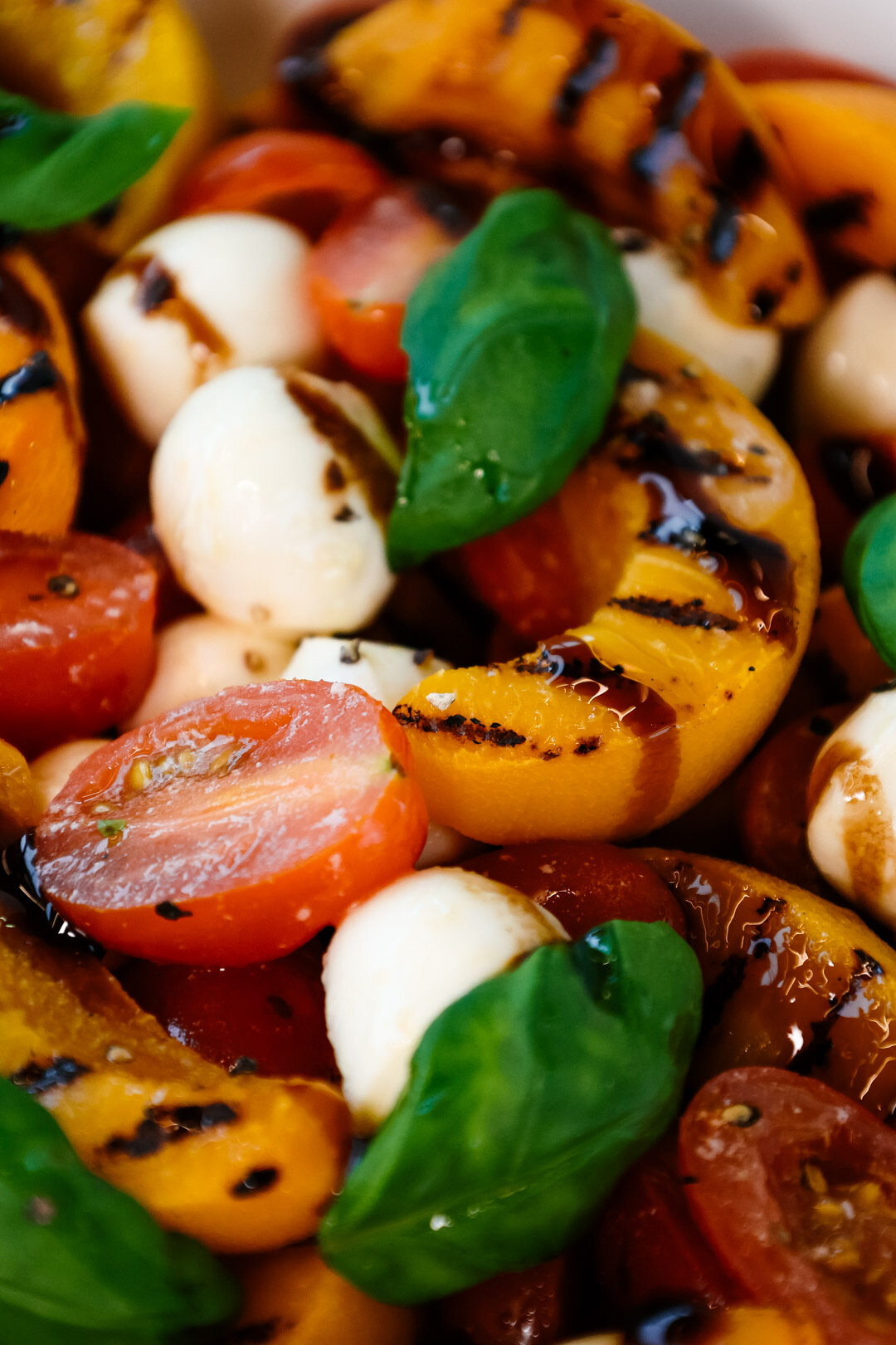 Arrange the cherry tomato halves, mini mozzarella balls and grilled peaches on a serving platter.