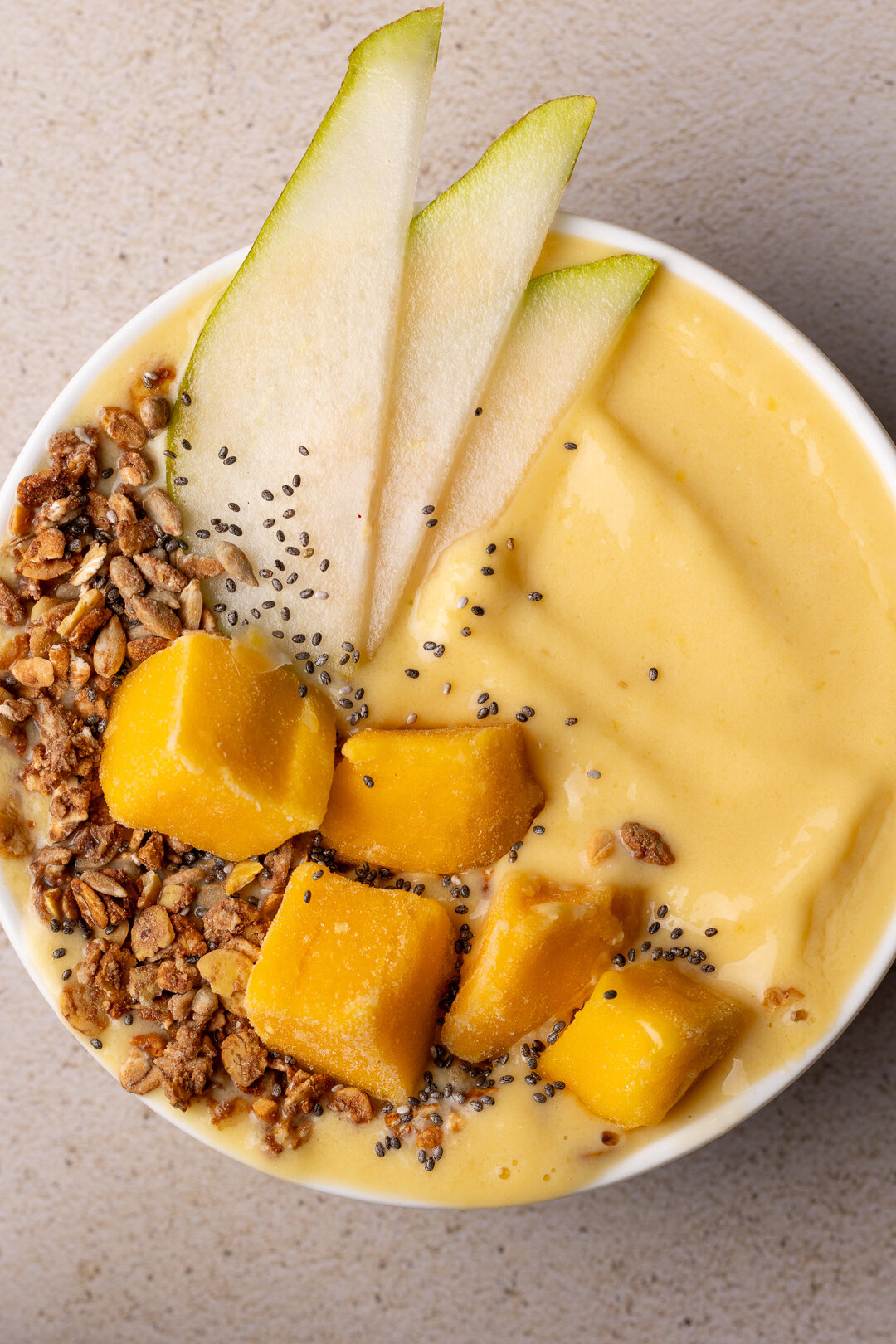 Scoop the blended smoothie into a bowl, and decorate with pear slices, frozen mango, peanut butter granola, and chia seeds.
