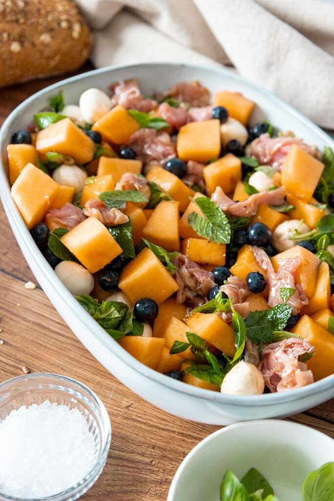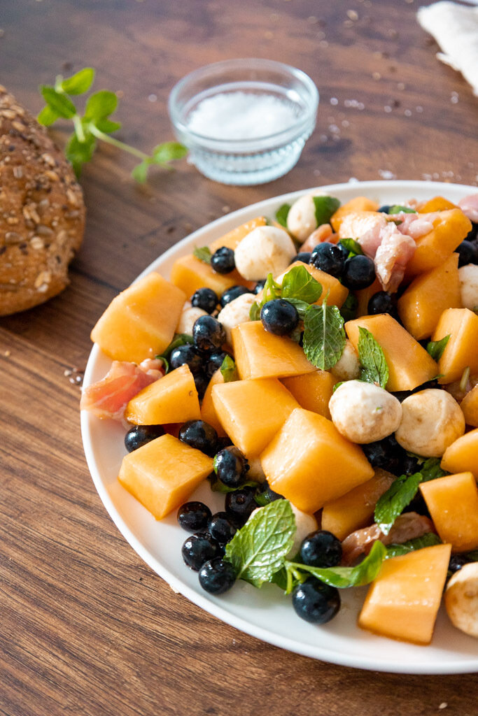 In a large bowl, combine the melon chunks, blueberries, and mozzarella balls. Tear the prosciutto into bite-size pieces and add it to the salad bowl. Add a handful of fresh basil and mint leaves into the bowl. You can tear the leaves into smaller pieces for better distribution