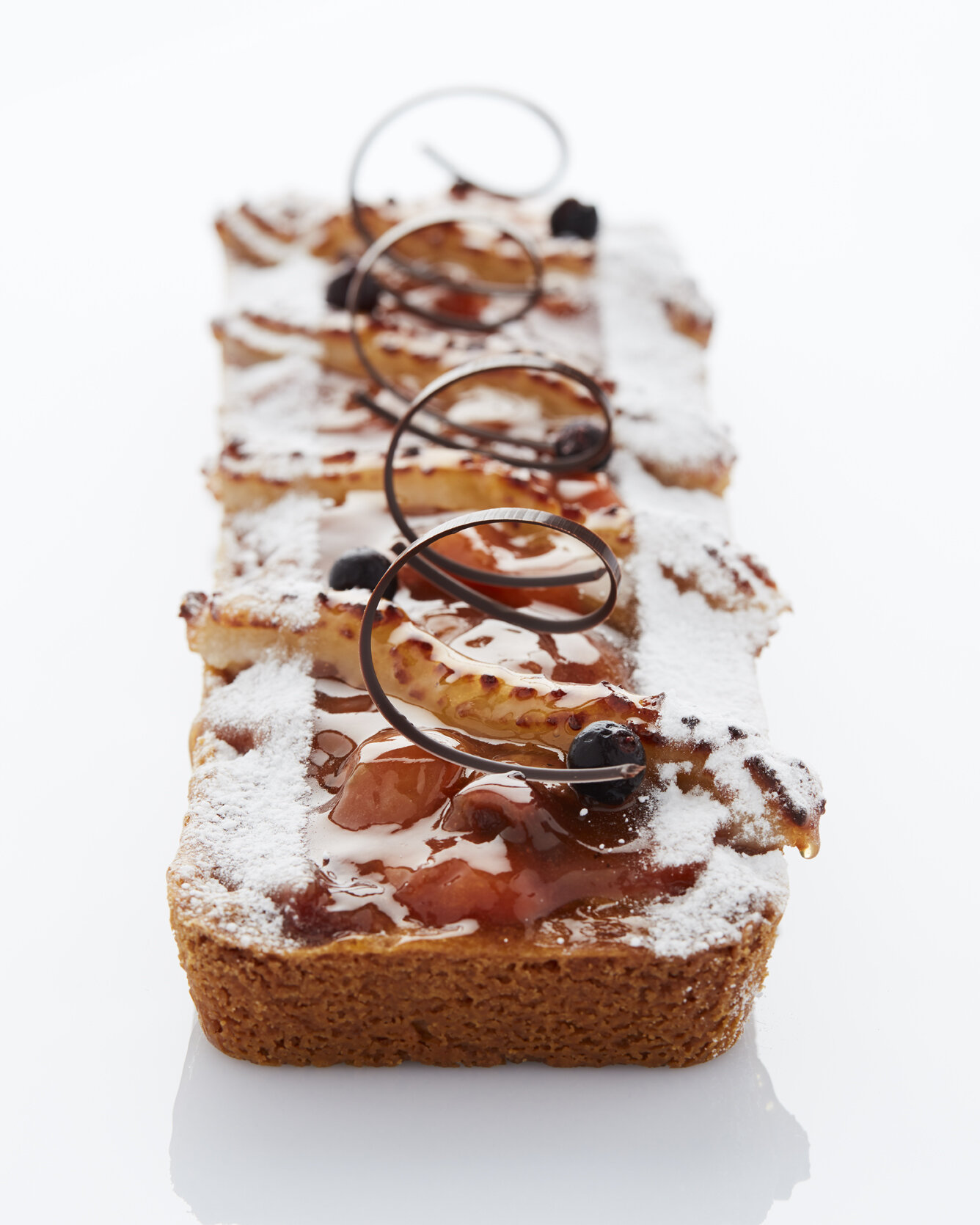 Soften the butter in a stand mixer. Add the brown sugar. Add the whole egg. Add the flour together with the baking powder and sodium bicarbonate. Store in the fridge overnight. Roll out to 6mm. Put in rectangular baking mould of 20x7 cm. Bake for 18 min at 210°C. Pipe a thin line of crème pâtissiere onto the sable Breton. Place the almond biscuit on top of the pudding.