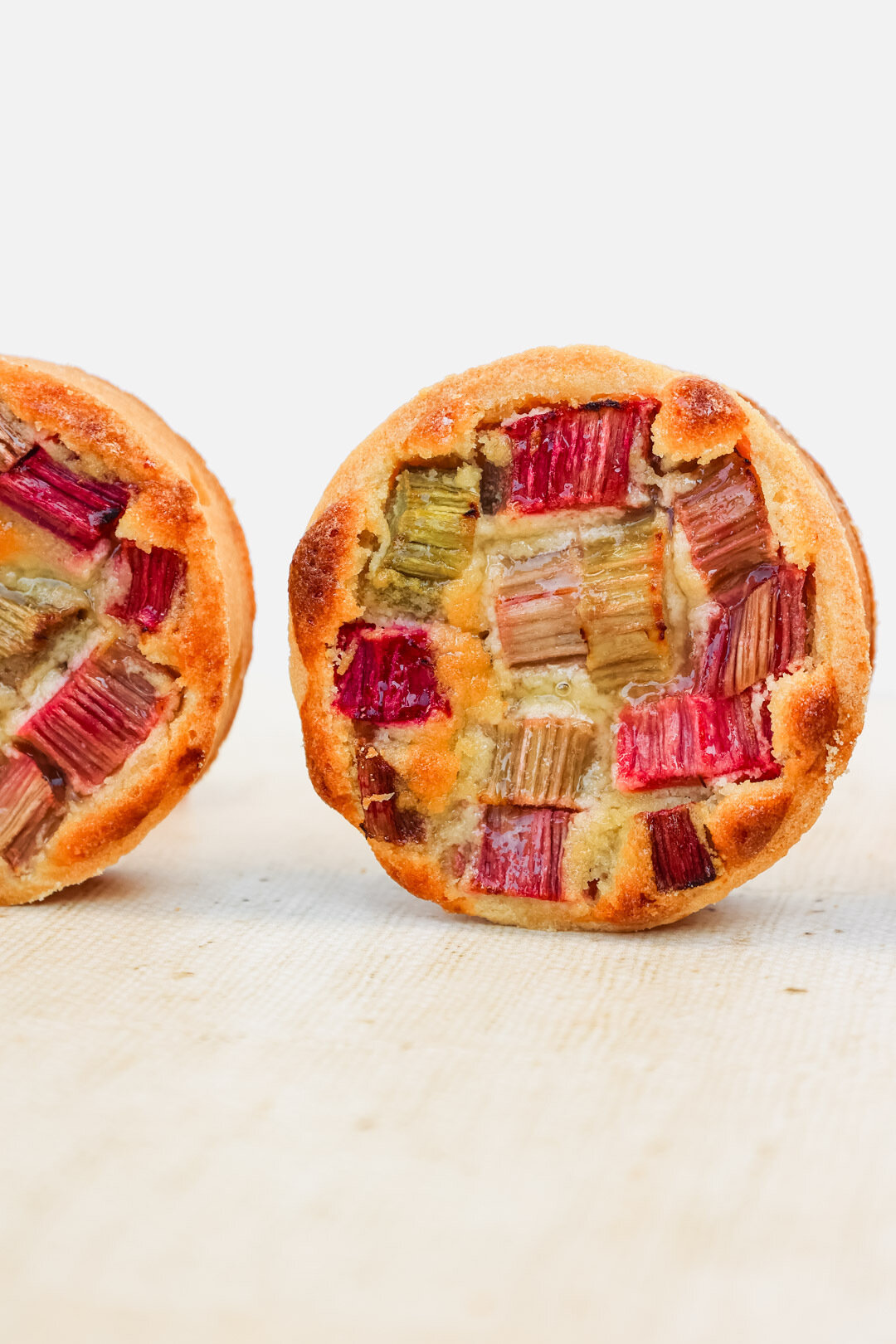 Delicate pastry tarts filled with rhubarb compote and frangipane, crowned with a glossy rhubarb glaze – a sweet, delicious and wholesome dessert.