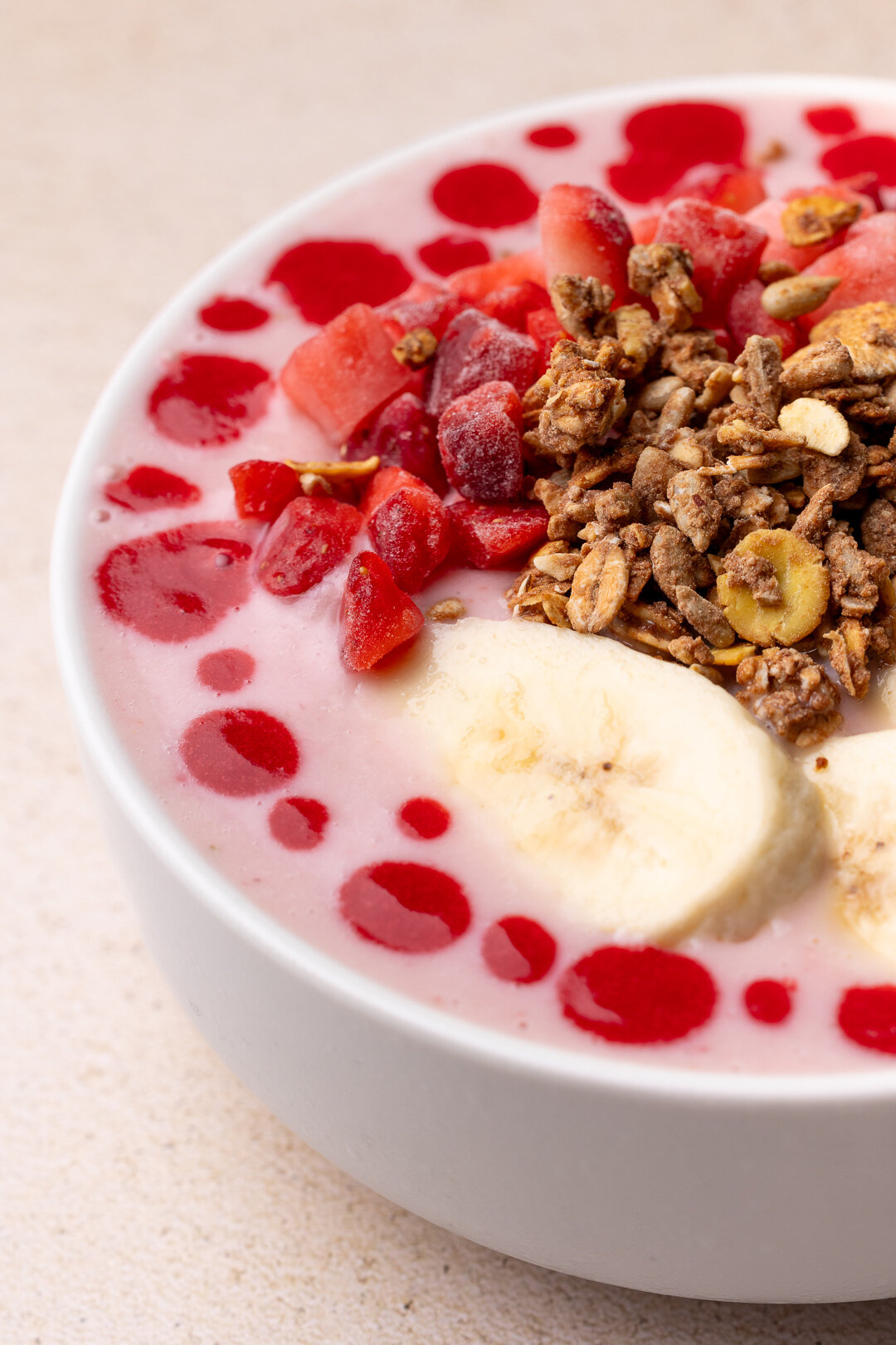 Scoop the blend into a bowl, and add frozen strawberry dices, banana, and peanut butter granola on top.
