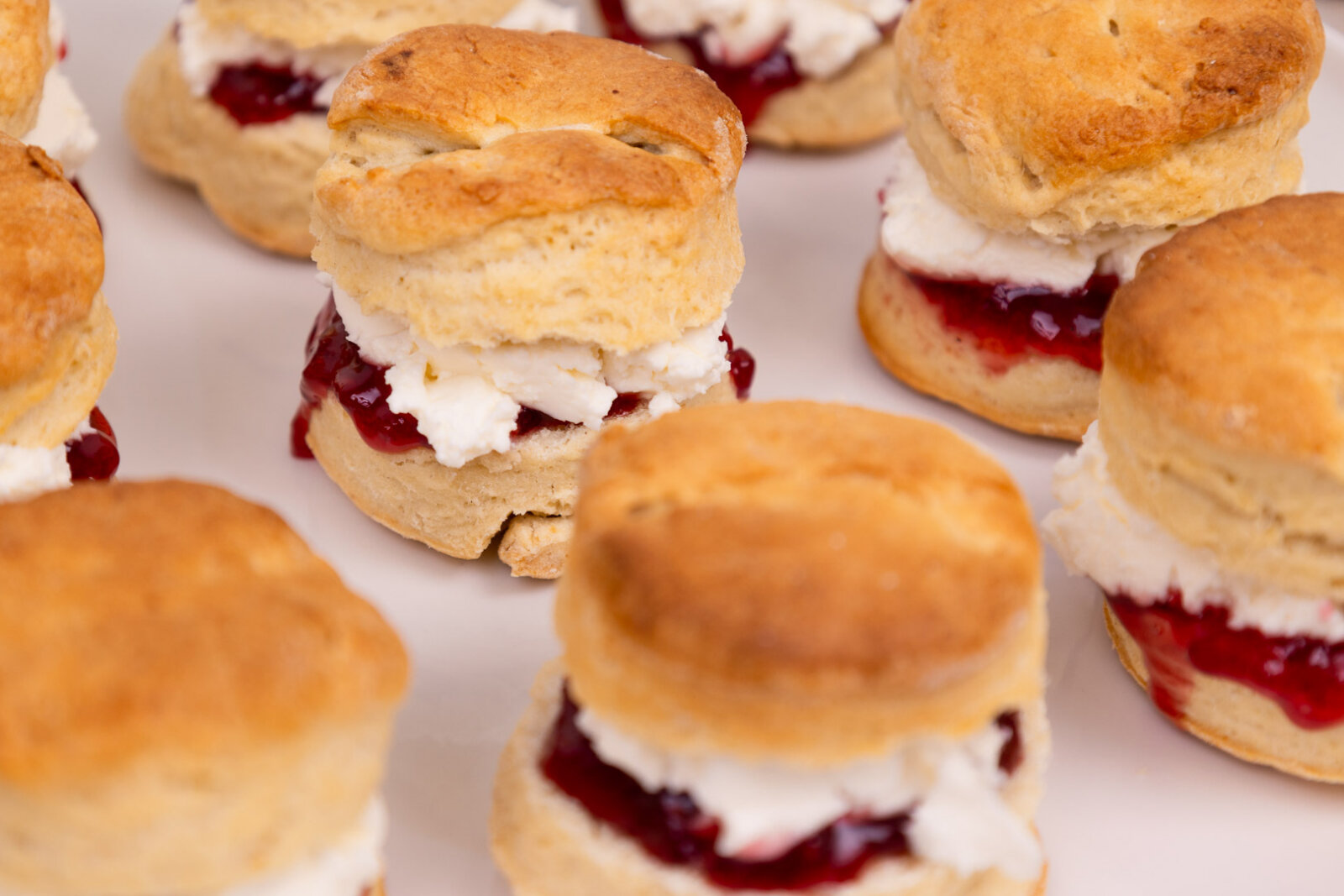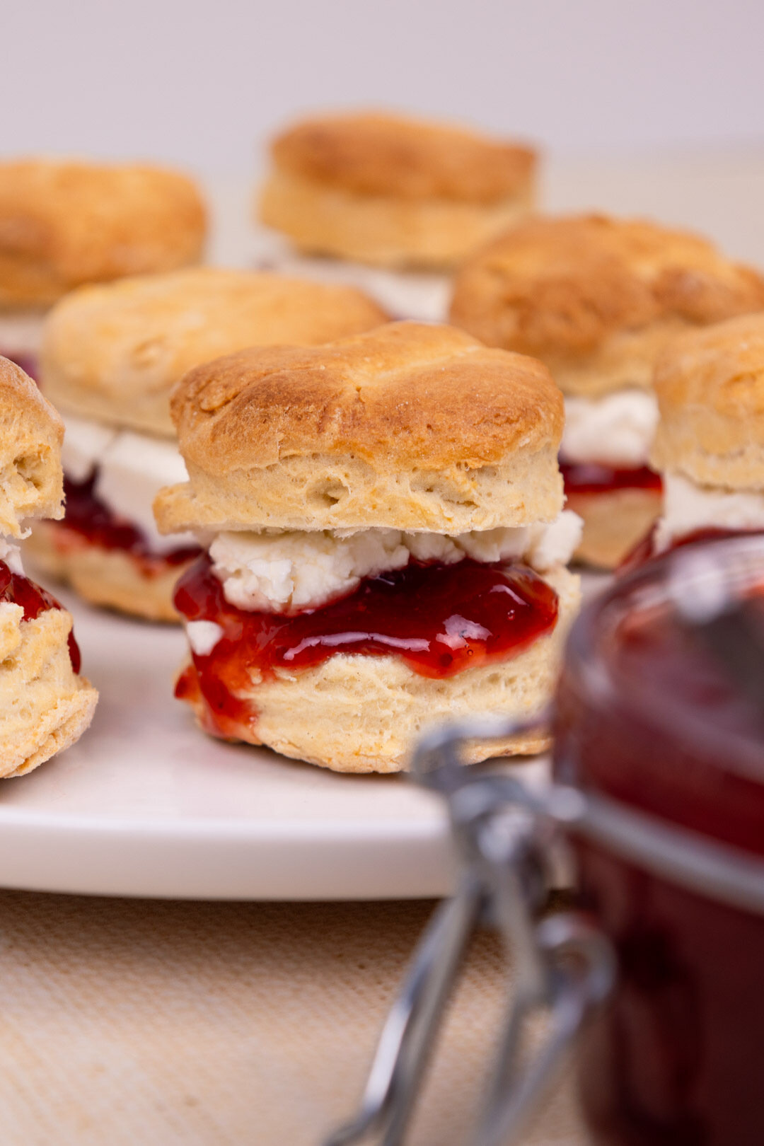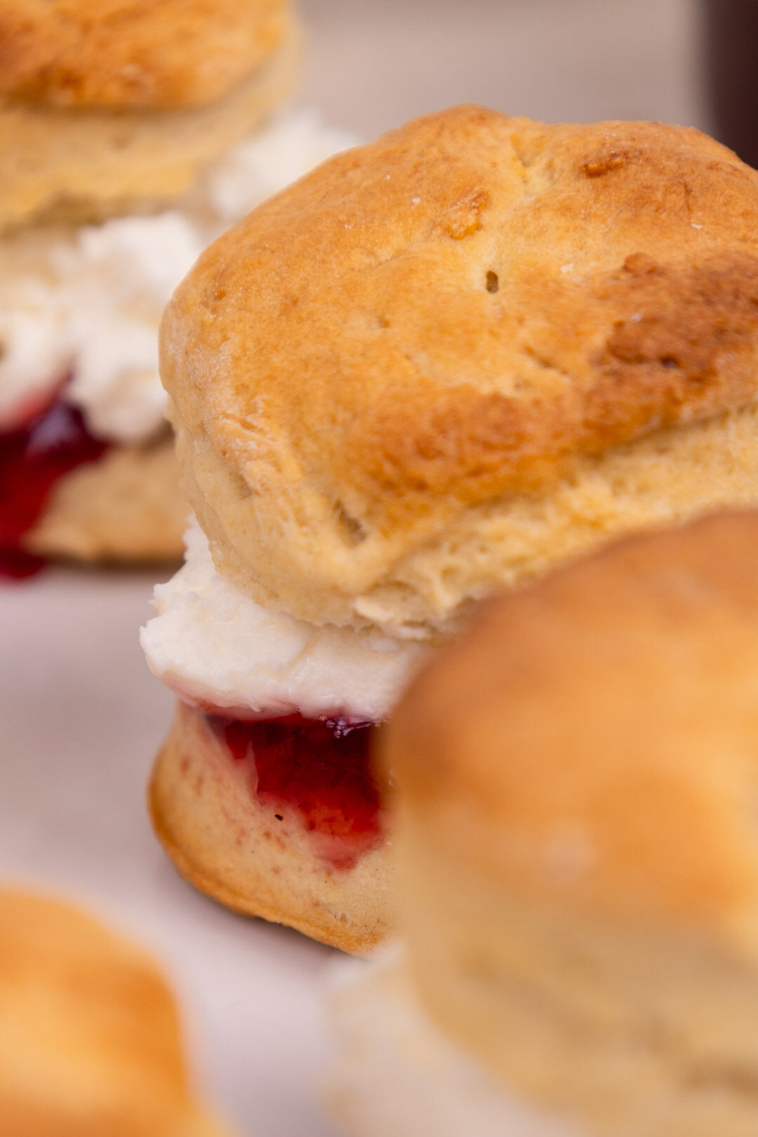 Slice the cooled scones in half horizontally. Spread a generous amount of homemade strawberry jam on the bottom half of each scone. Place a dollop of mascarpone cheese on top of the jam and gently place the top half of the scone over the mascarpone cheese to form a sandwich.