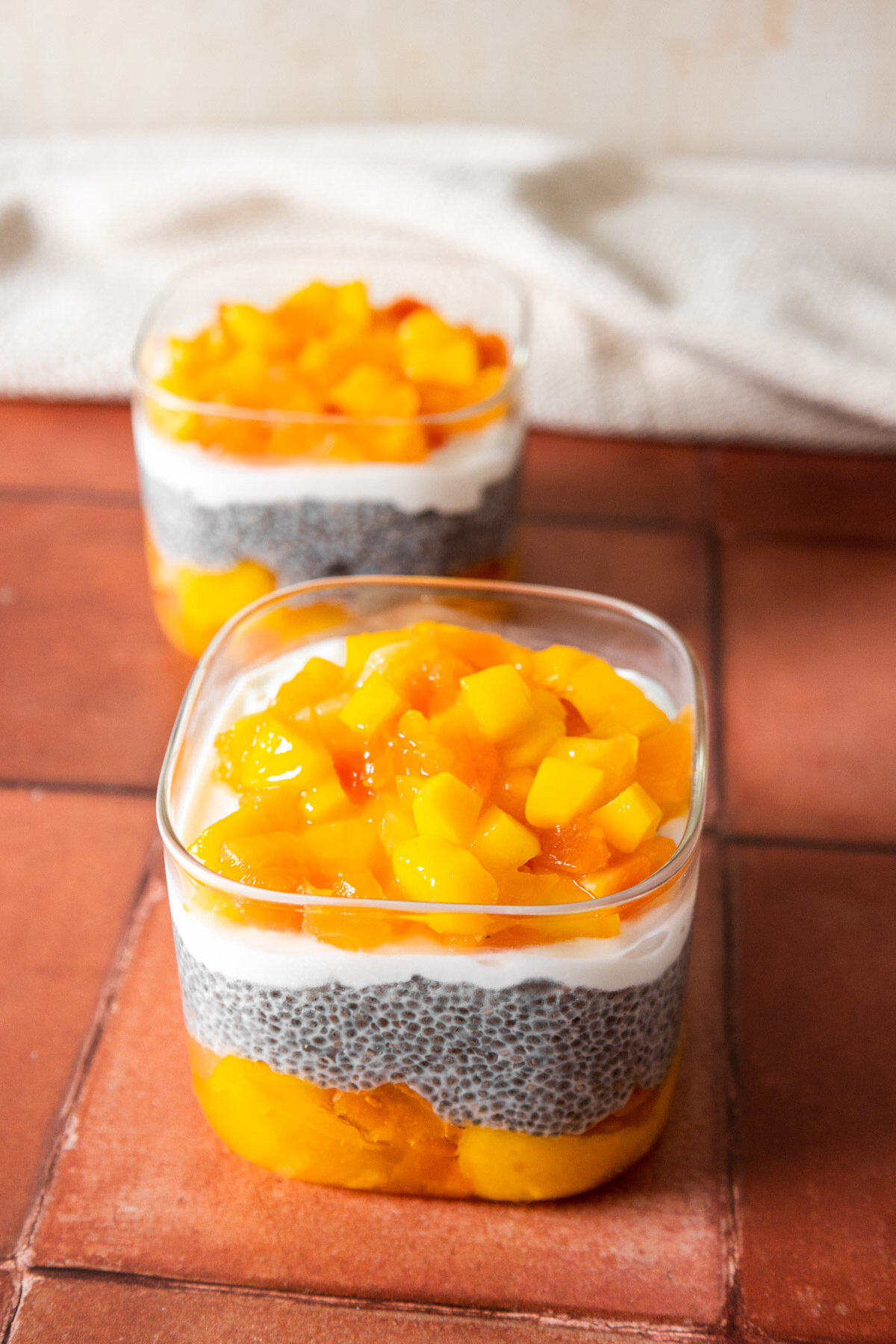In a serving bowl, add the papaya and mango chunks. Add a generous layer of the chia mixture. Add 3 tbsp of coconut yoghurt. Top with exotic fruit topping. For extra sweetness, drizzle some honey on top.